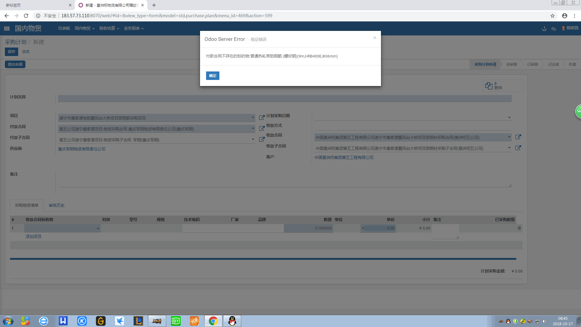 在录入采购计划时出现“付款合同不存在的标的物”错误提示,如图。