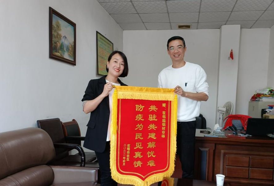 4月21日上午,夜明珠社区书记聂芳一行到夜明珠市场赠送了“共驻共建解忧难 防疫为民见真情”锦旗,感谢夜明珠市场管理业务部在疫情防控工作上给予政府的大力支持,对夜明珠市场防疫工作也给予了肯定,双方就前期已完成工作及后续工作进行了交流,将继续共同努力,筑牢疫情防控安全防线。